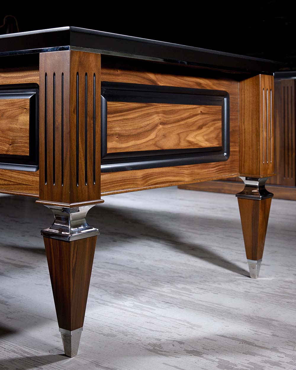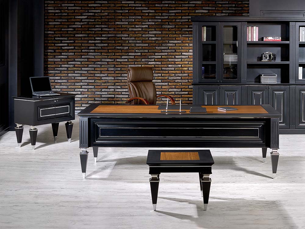 Vizyon Büro Mobilyaları’nın bu yarı klasik avangart modeli ofisinde klasik bir dokunuş isteyen yöneticilerin tercihi. KLAS’ın krom parçalı klasik çizgideki ayakları ve masa yüzeyinde kullanılan deri sümenler çalışma ortamınıza şıklık ve saygınlık katıyor. Doğal Amerikan Ceviz Kaplama dışında siyah ve antrasit lake opsiyonlarıyla sunulan KLAS Vip Makam Takımı , farklı dolap seçenekleriyle de ofisinizin tarzına ve ihtiyaçlarınıza uygun alternatifler sunmakta.