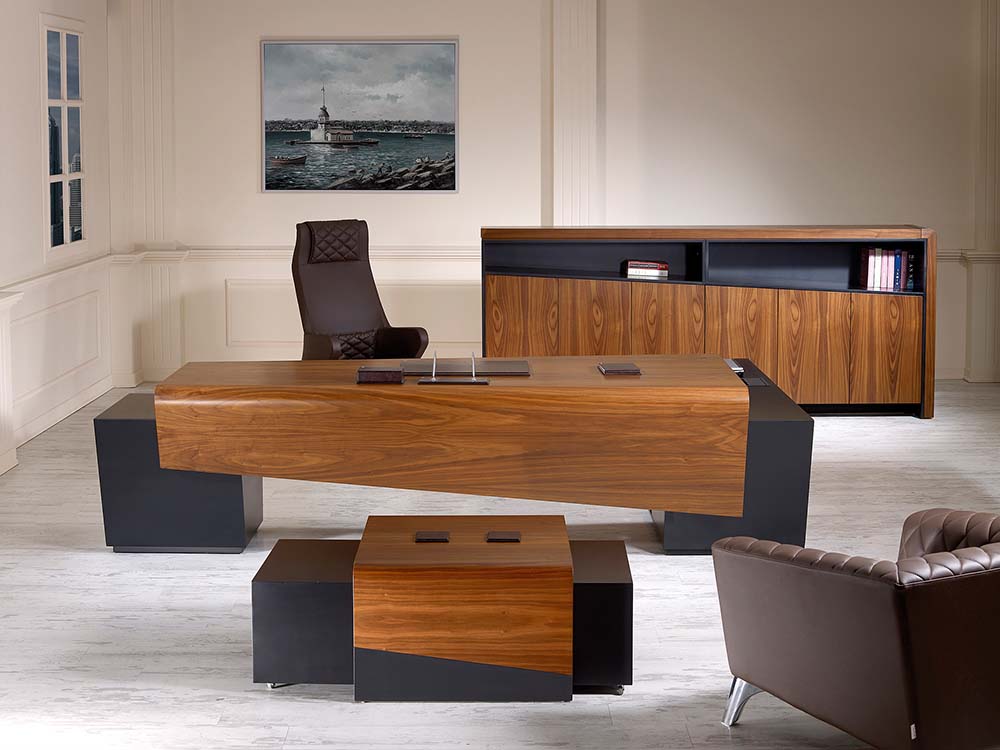 Masa üst paneli ve perdeyi tek bir parçada birleştiren GLORY’de ahşap işçiliği en üst düzeyde. Kendine has çizgilerini dolap ve sehpada sürdüren GLORY Vip Makam Takımı standart bir para kasasına da sahip. Orta ve yan sehpaları birleştiren modüler sehpa tasarımı ise oldukça modern ve fonksiyonel.