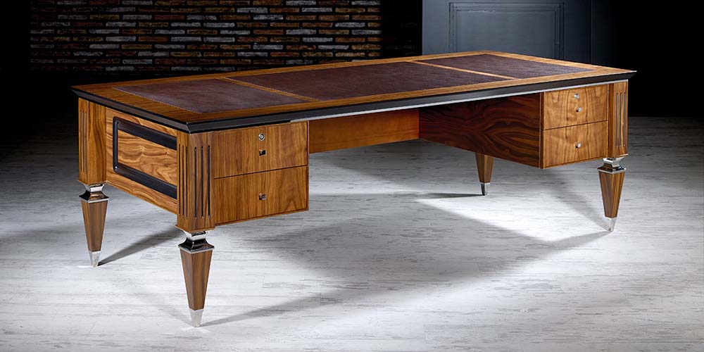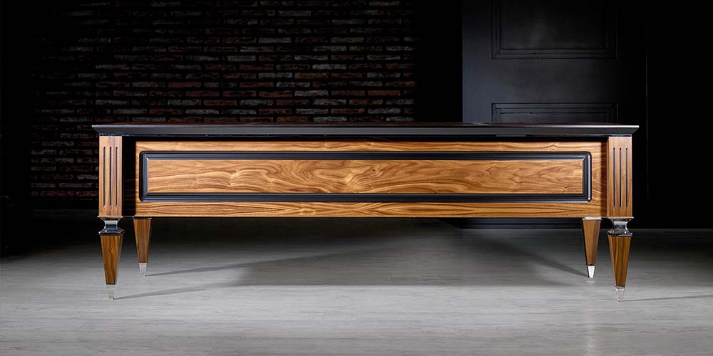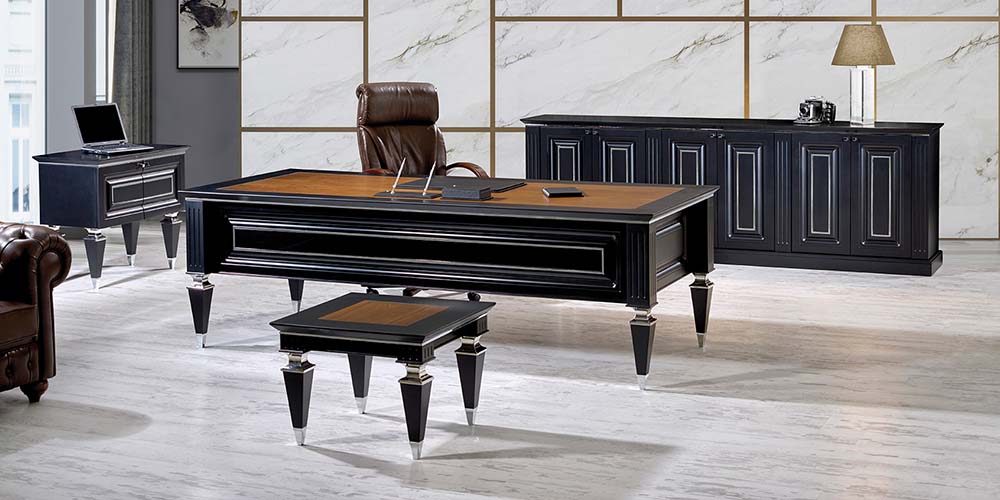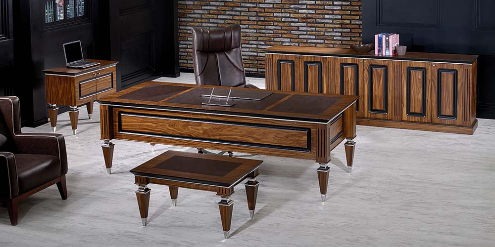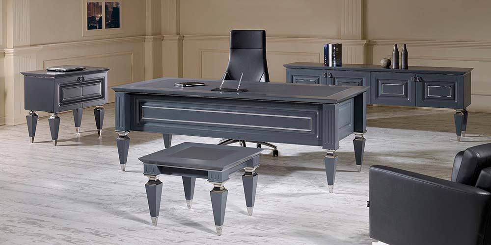 Vizyon Büro Mobilyaları’nın bu yarı klasik avangart modeli ofisinde klasik bir dokunuş isteyen yöneticilerin tercihi. KLAS’ın krom parçalı klasik çizgideki ayakları ve masa yüzeyinde kullanılan deri sümenler çalışma ortamınıza şıklık ve saygınlık katıyor. Doğal Amerikan Ceviz Kaplama dışında siyah ve antrasit lake opsiyonlarıyla sunulan KLAS Vip Makam Takımı , farklı dolap seçenekleriyle de ofisinizin tarzına ve ihtiyaçlarınıza uygun alternatifler sunmakta.